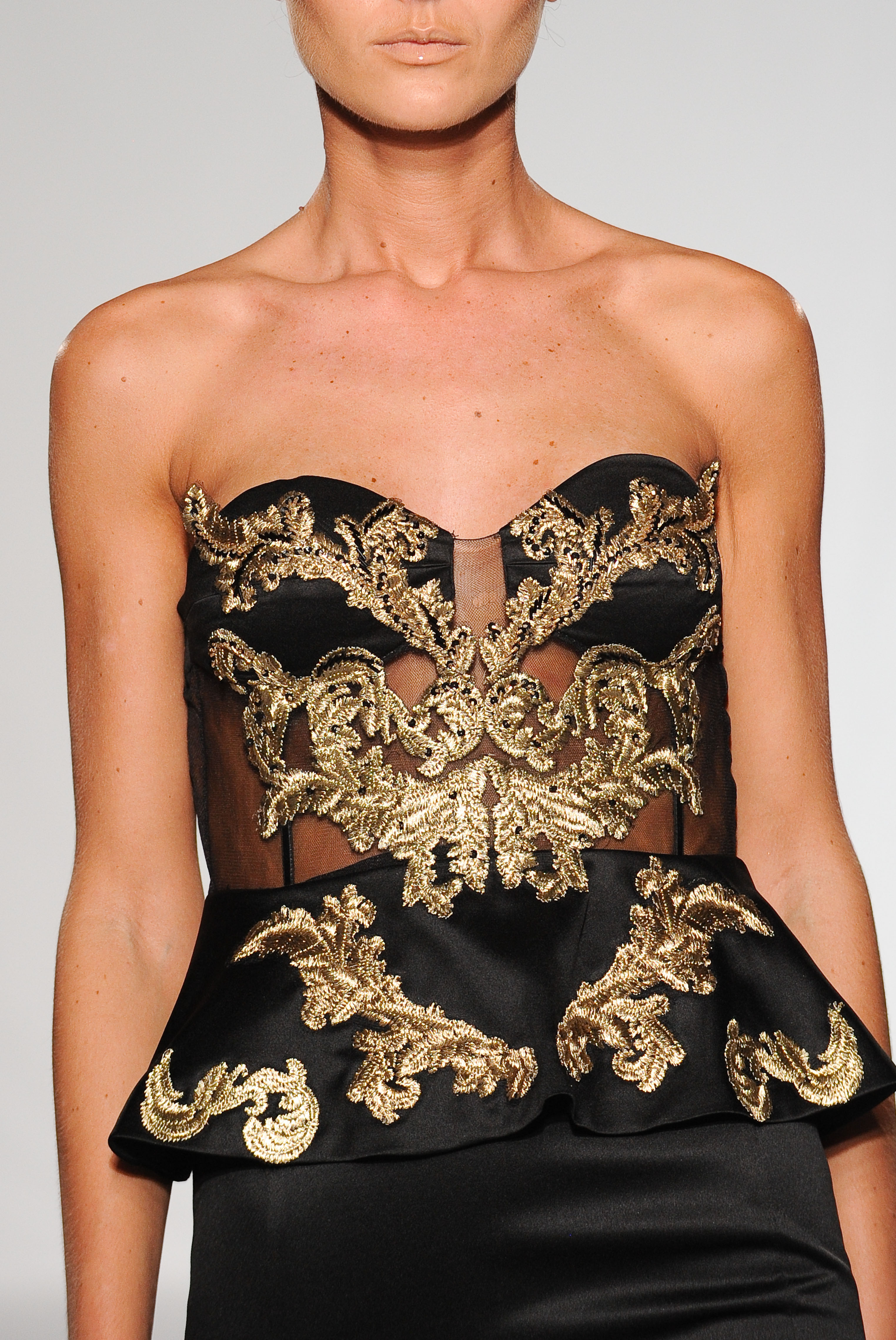 Fourreau à fine basque en satin duchesse noir au buste en organza transparent rebrodé de fils or. Black duchess satin gown with sheer organza bust embroidered with golden thread. Lucie