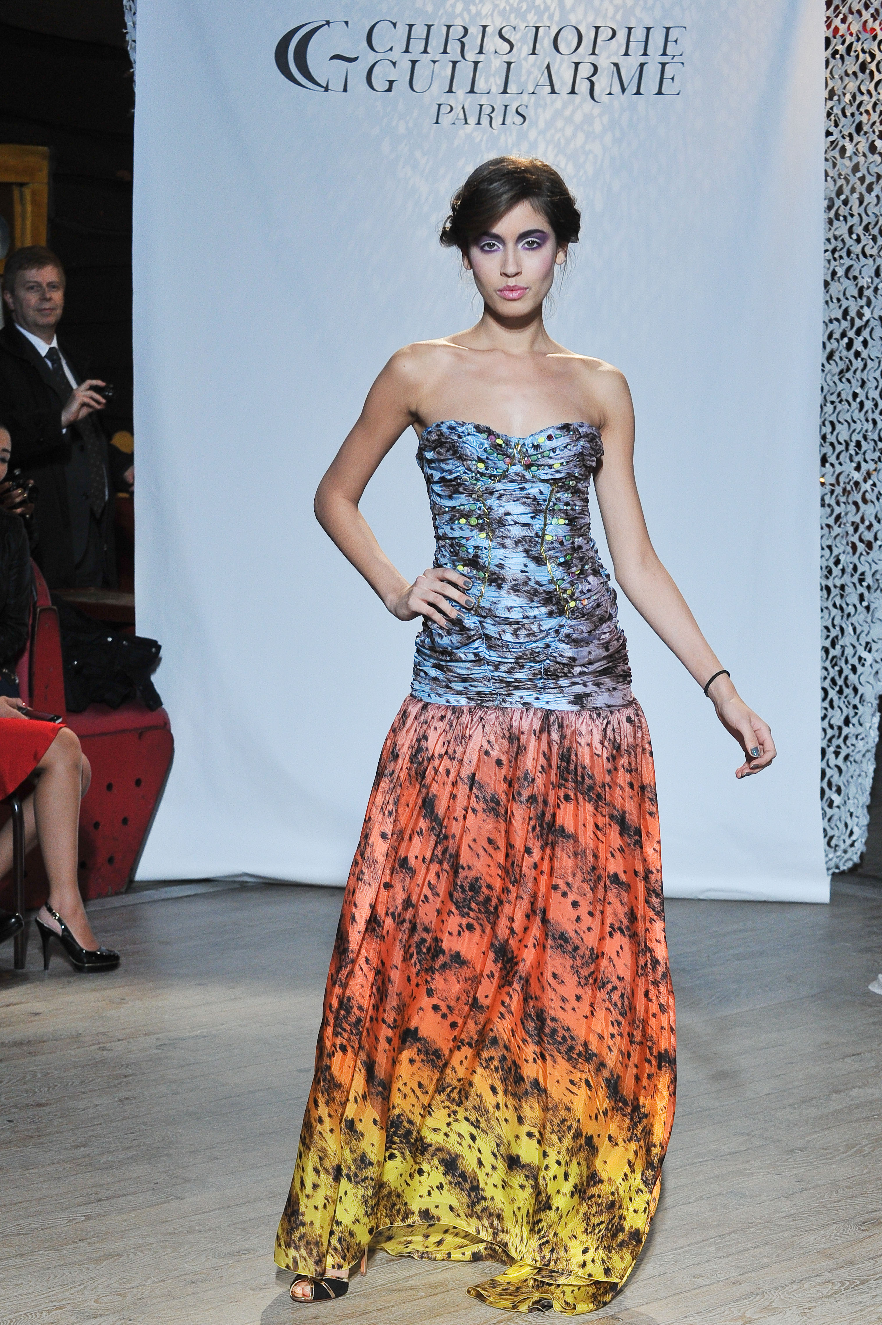 Fall-Winter 2013-2014 fashion show «Boheme» - Christophe Guillarme Paris - Tuesday February 26th 2013 at Balajo - Paris Fashion Week - Longue robe bustier en mousseline de soie froncée imprimée panthère dégradée du bleu au jaune. - Leopard printed silk chiffon long bustier dress fully gathered and shaded from light blue to yellow. Isabella
