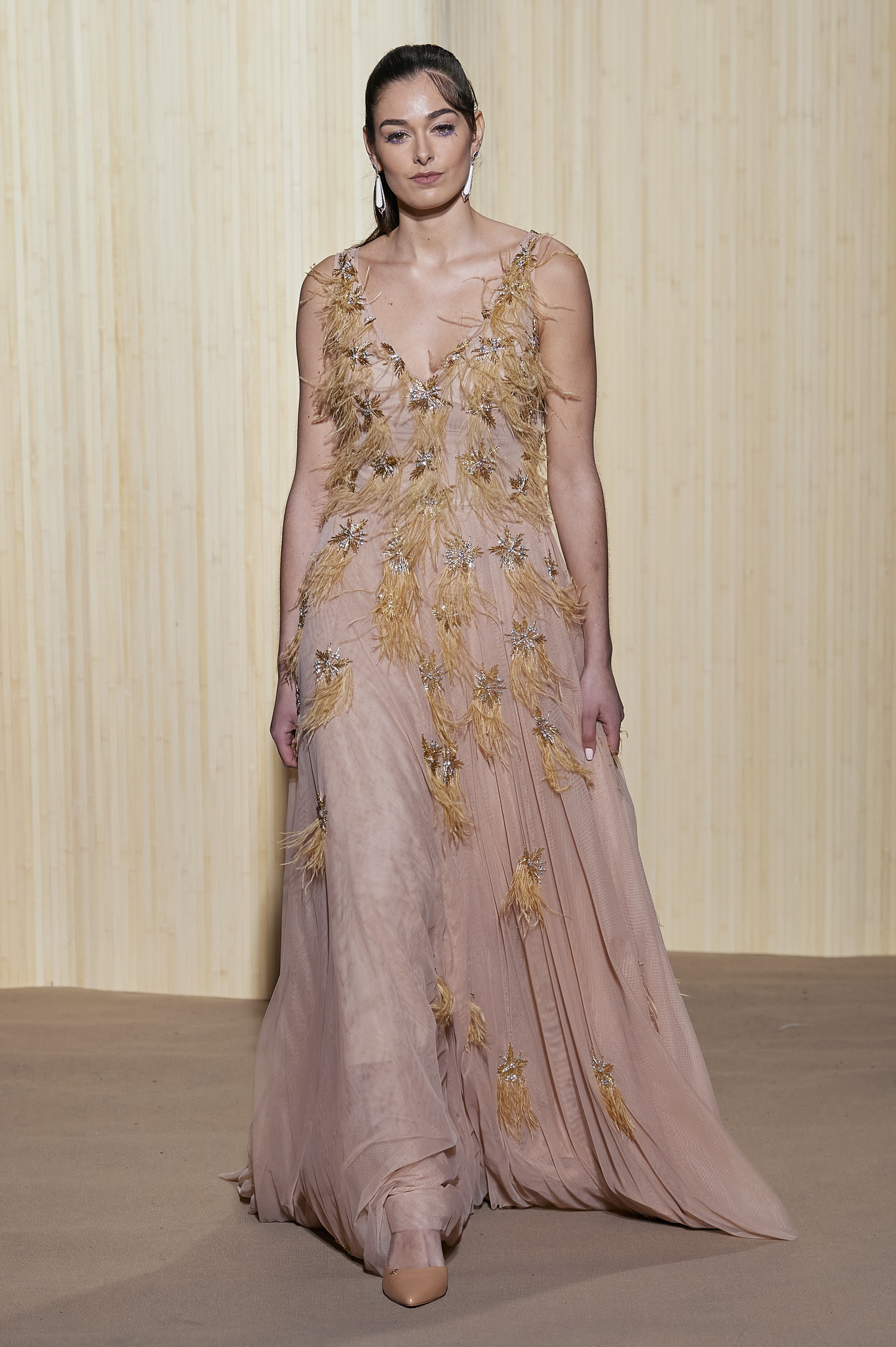 look 13 - longue robe encolure V en tulle nude rebrodé de plumes de marabout - nude tulle V-neck long dress applied with marabout feathers - Lison Di Martino