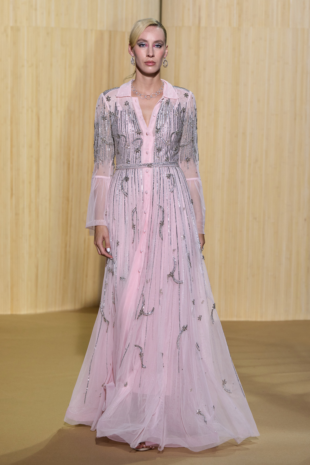 look 20 - longue robe chemise en tulle rose poudré rebrodé - long shirt dress in soft pink tulle embroidered with maxi sequins - Magda Swider