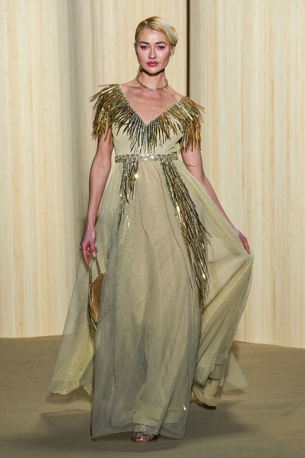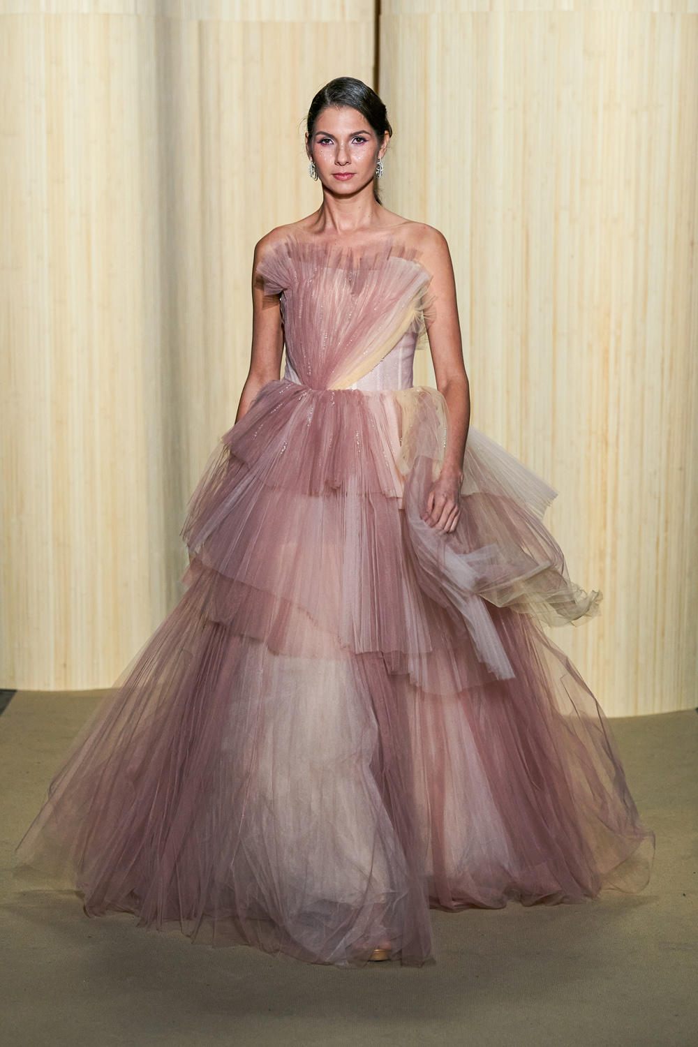 with tuxedos enhanced with feathers. Transparencies of soft pink tulle sprinkled with crystals and extravagant embroidery complete this dreamlike and burlesque vision. Maxi dresses in crumpled tulle reveal the audacity of this first muse of glamour.
