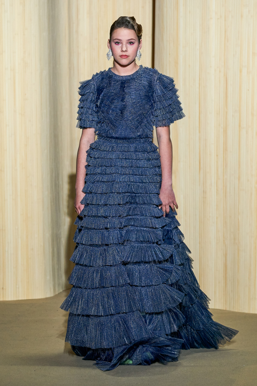 with tuxedos enhanced with feathers. Transparencies of soft pink tulle sprinkled with crystals and extravagant embroidery complete this dreamlike and burlesque vision. Maxi dresses in crumpled tulle reveal the audacity of this first muse of glamour.