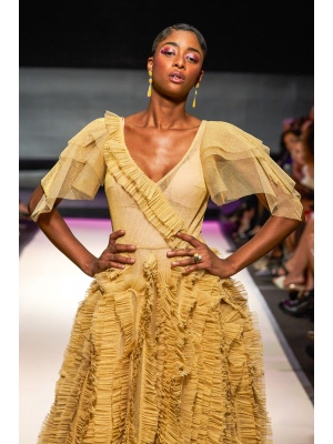 golden tulle maxi dress with skirt applied with frilled bands