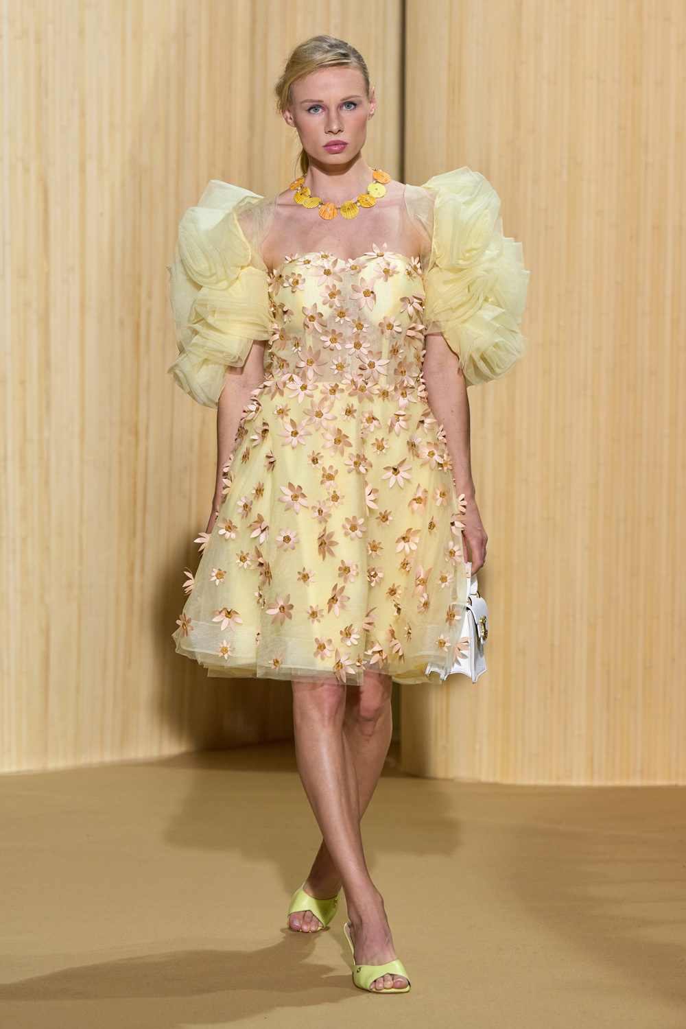 Des coloris psychédéliques telle que le turquoise, les pastels dont le jaune mimosa, le mauve et le pêche enchantent ce vestiaire. Des volumes ultra ajustés ou des maxi robes en cascades de tulle pour une diversité planétaire.