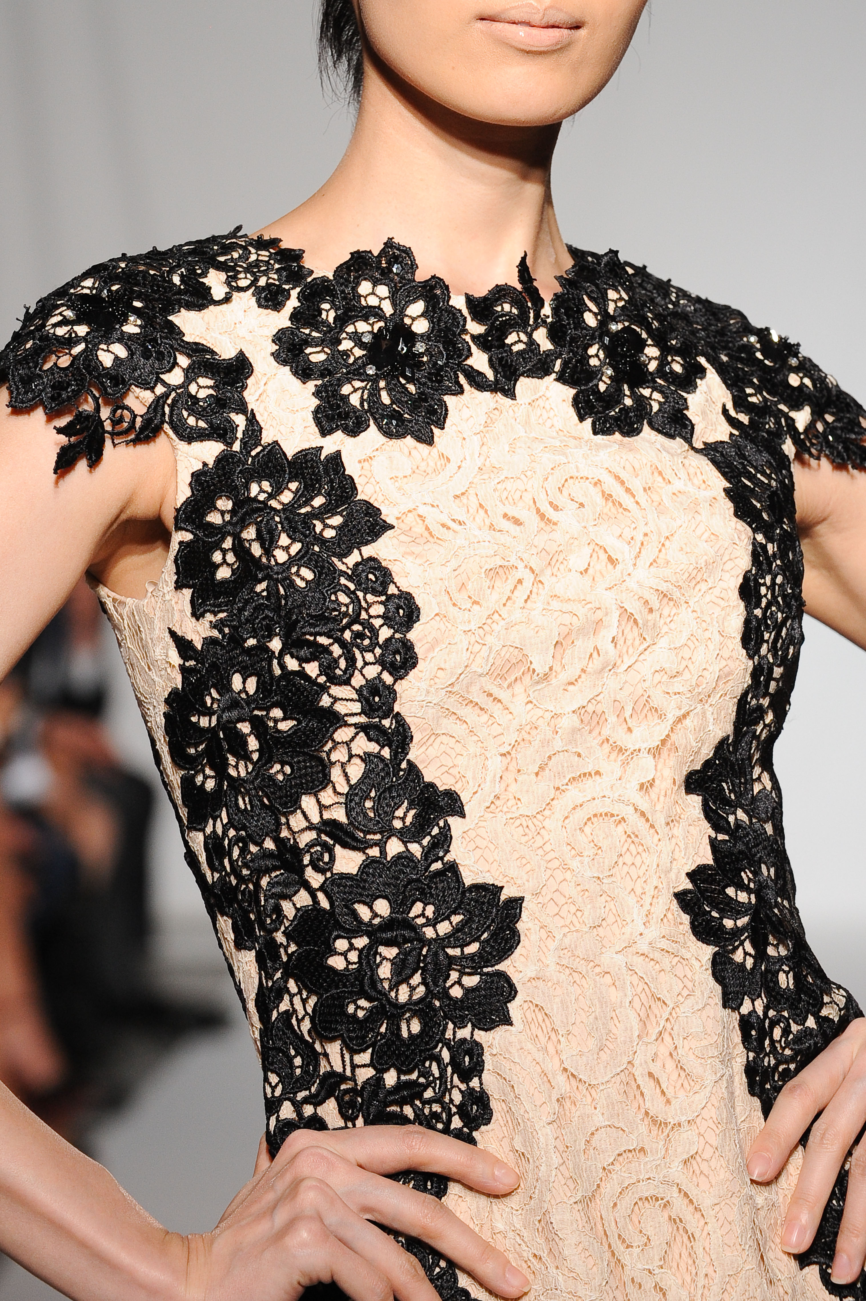 Fourreau à encolure fermée en dentelle bicolore noire et beige. Closed neckline gown in two tones beige and black lace. Carrie