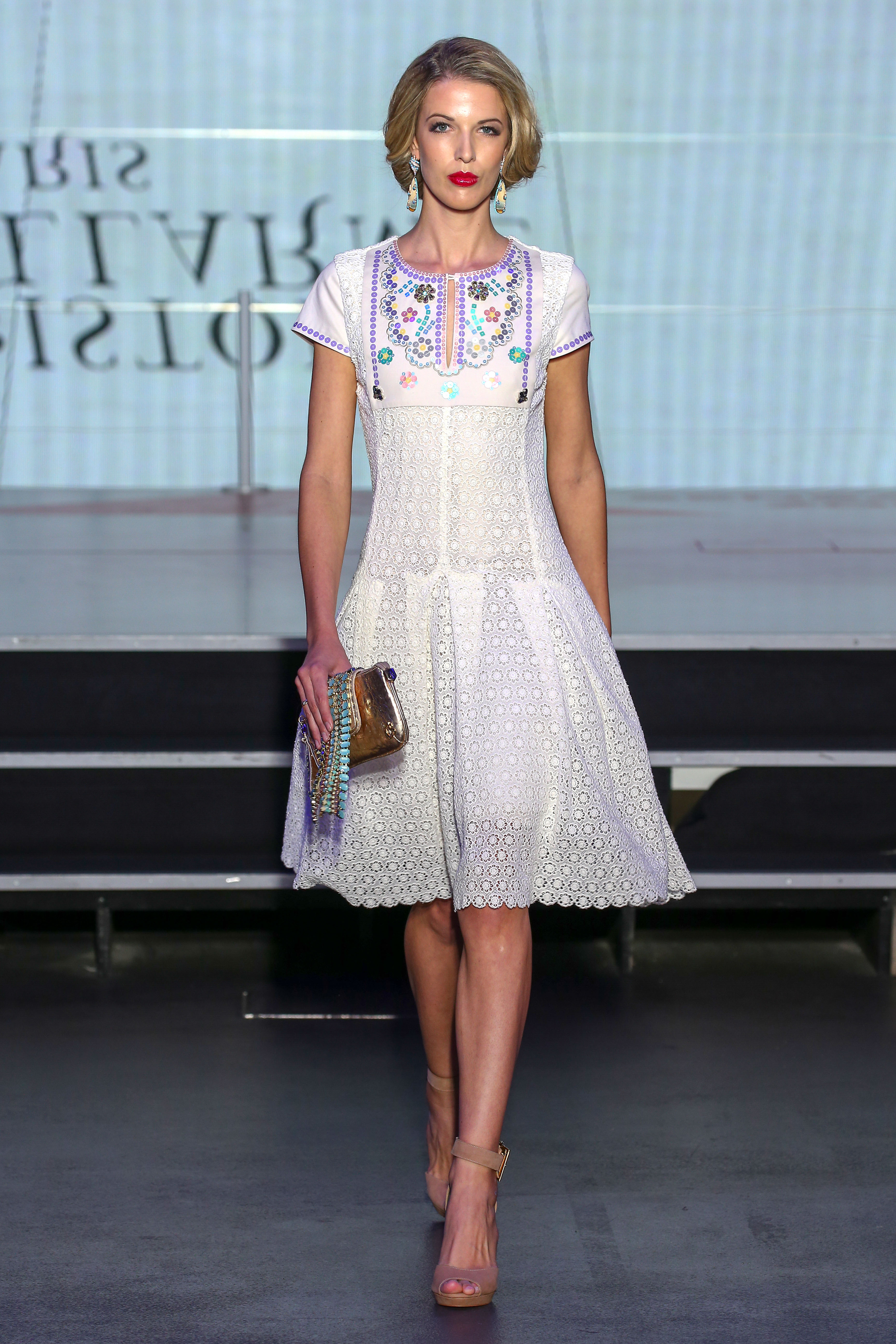 Les coloris pastels sont déclinés en color block et le blanc se fait théâtral en maxi robe en faille de soie ou en mini robe de dentelle en relief.
