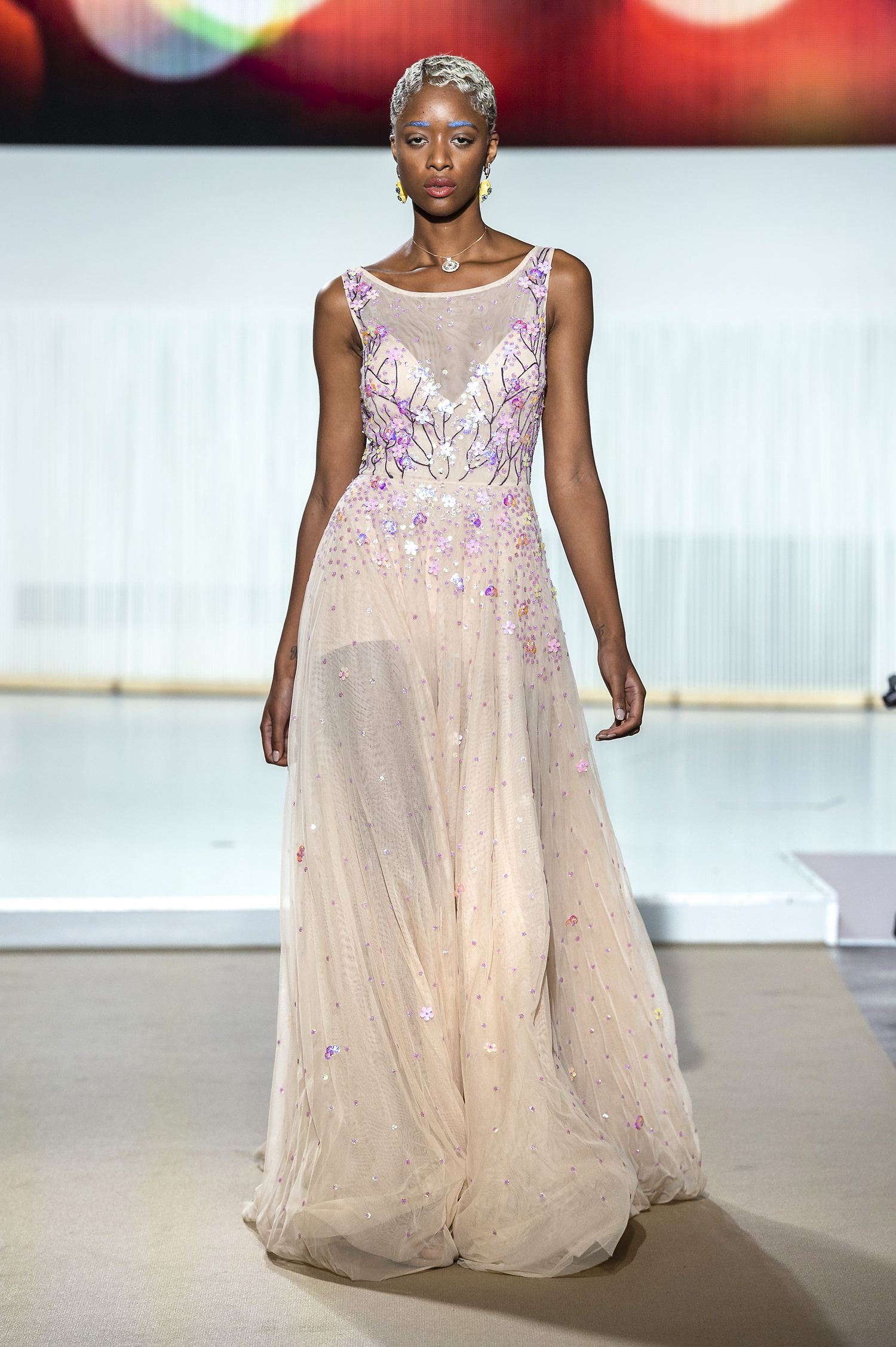 Une illusion dans un imprimé de branches recouvert de tulle rebrodé d’insectes.