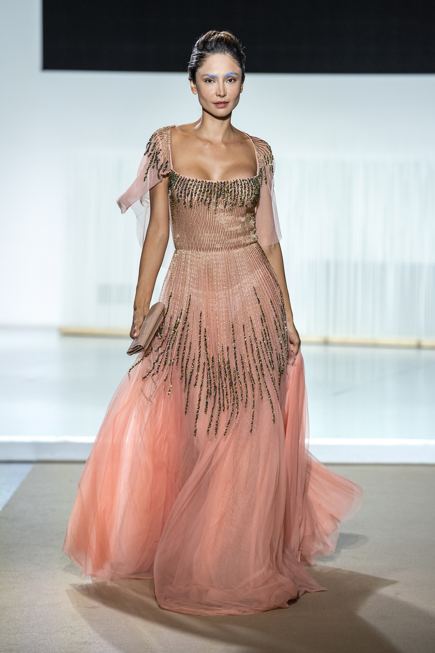 Le vestiaire est donc comme un songe embrumé de tulle vaporeux au milieu d’un échiquier graphique. De la mousseline de soie blanche virginale, du nude beige rehaussé de rouge laqué dans un maxi imprimé abstrait ou du bleu azur.