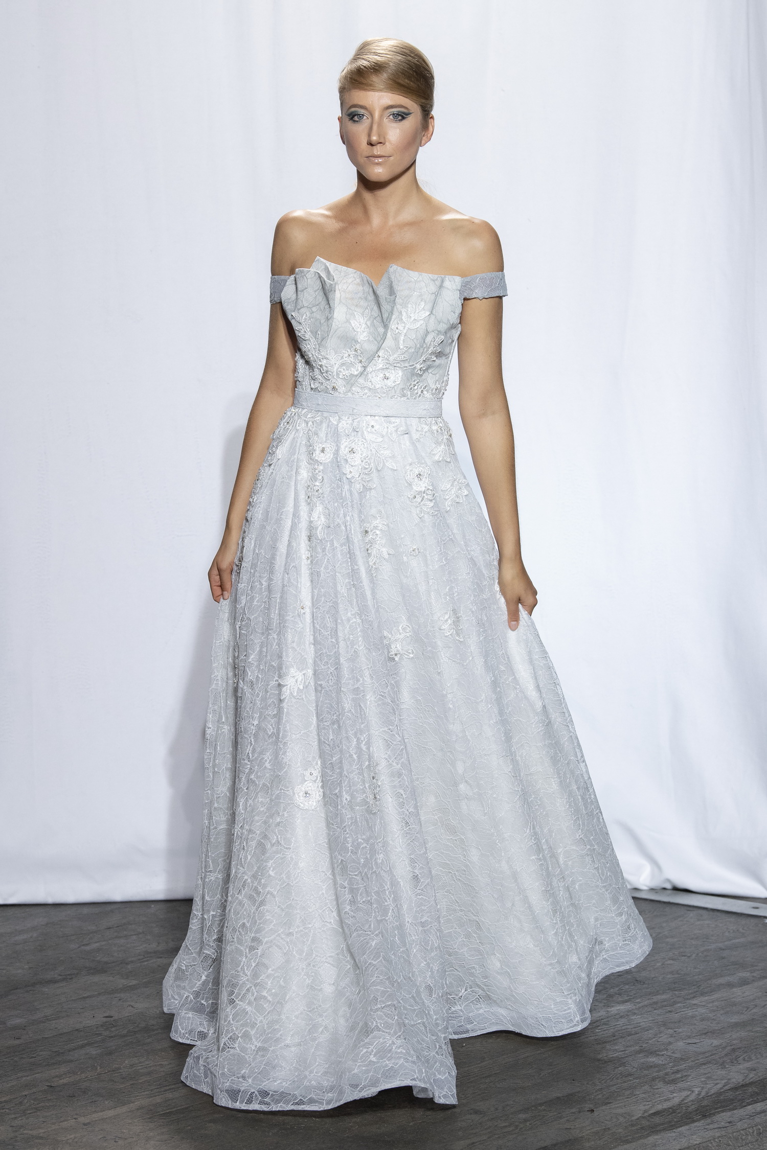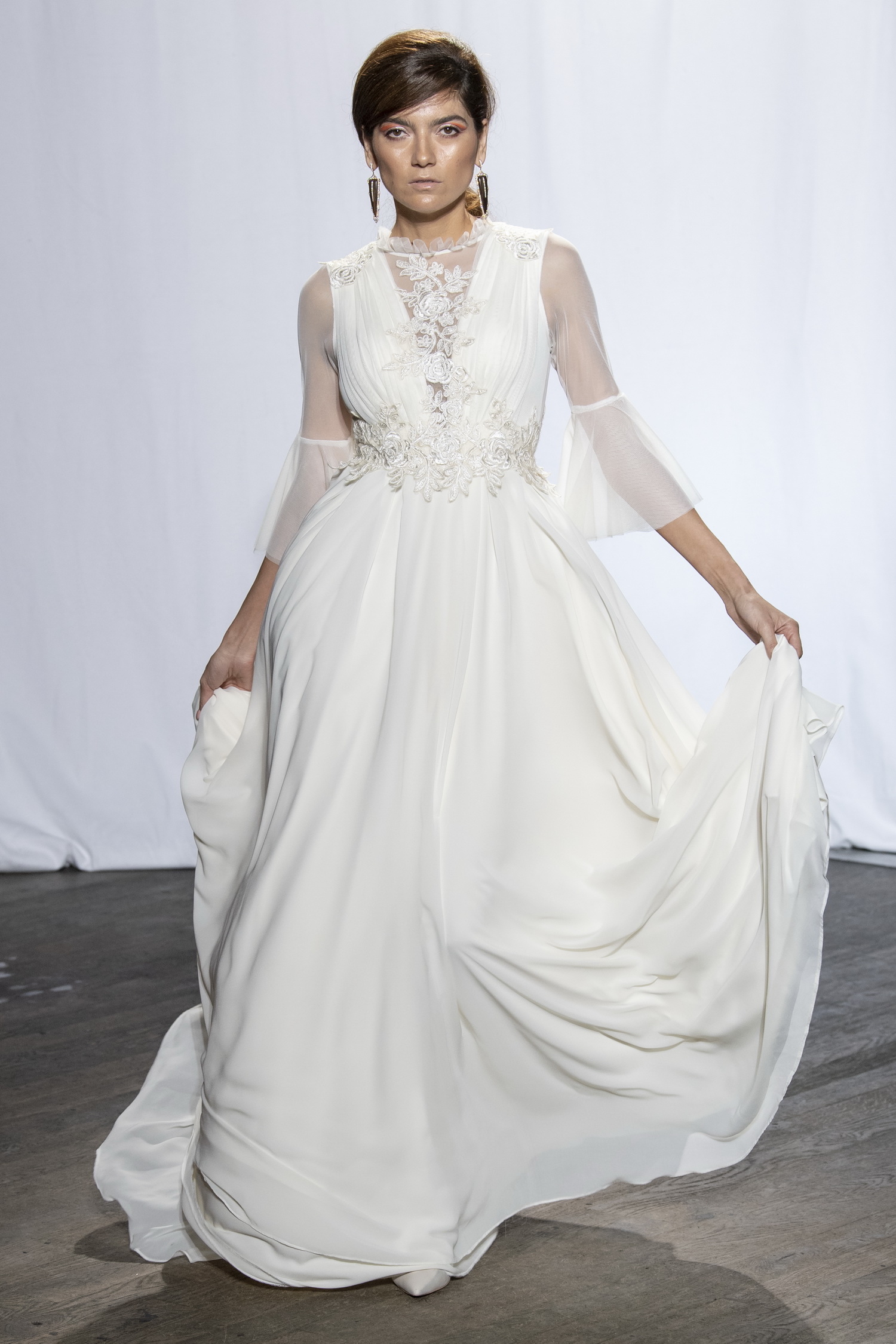 Ces couleurs sont le nude en dégradé de tulle, le rose poudré dans une maxi résille ou le pêche dans une dentelle volumineuse, le blanc en mini robe, le rouge passion en imprimé fleuri ou en crêpe envers satin et le doré en franges de broderies de perles…