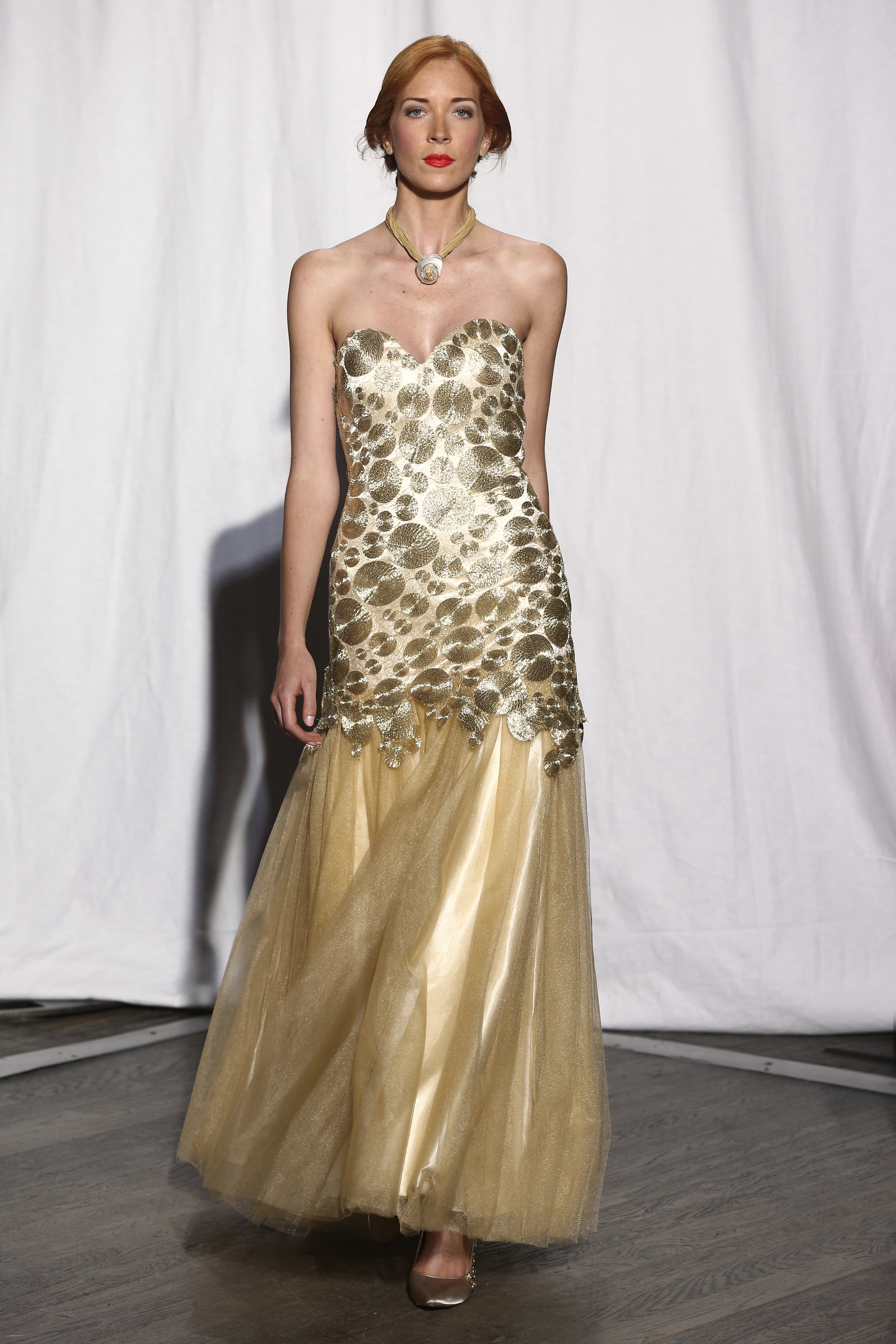 Robe bustier en tulle dore recouvert de dentelle spirale au fil dore. Golden tulle strapless dress covered with spiral design lace. Joanna -