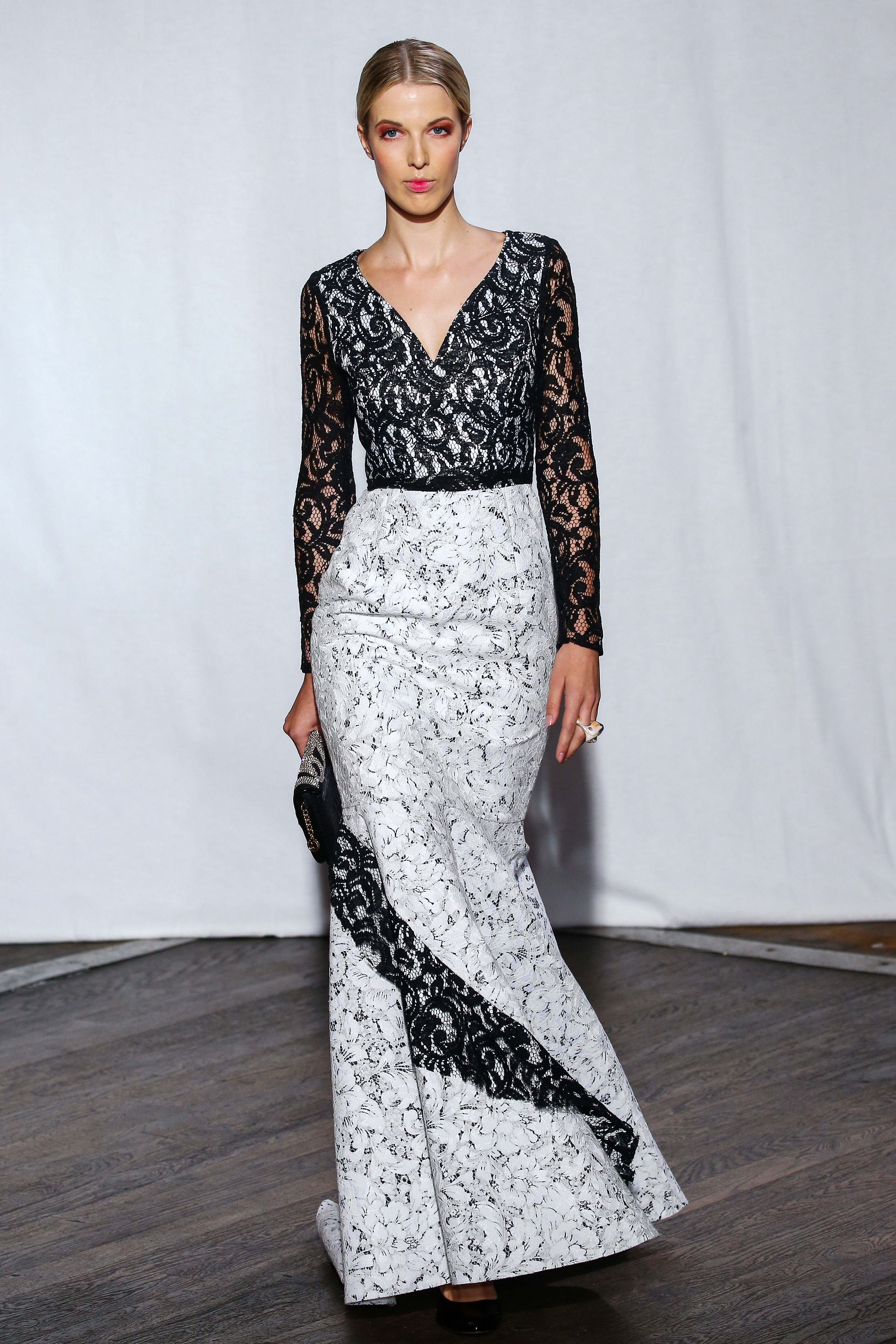 Tandis que la madone dévoile des dentelles blanches plissées et des imprimés fleuris, son double dans le miroir joue le glamour rétro version traîne en broché argenté, ou en maxi robe en faille de soie. Silhouette de sirène éthérée en tulle bouillonné ou mélange de noir et blanc enivrent et distillent une nouvelle écriture sur le fil du rasoir du fatal fourreau.