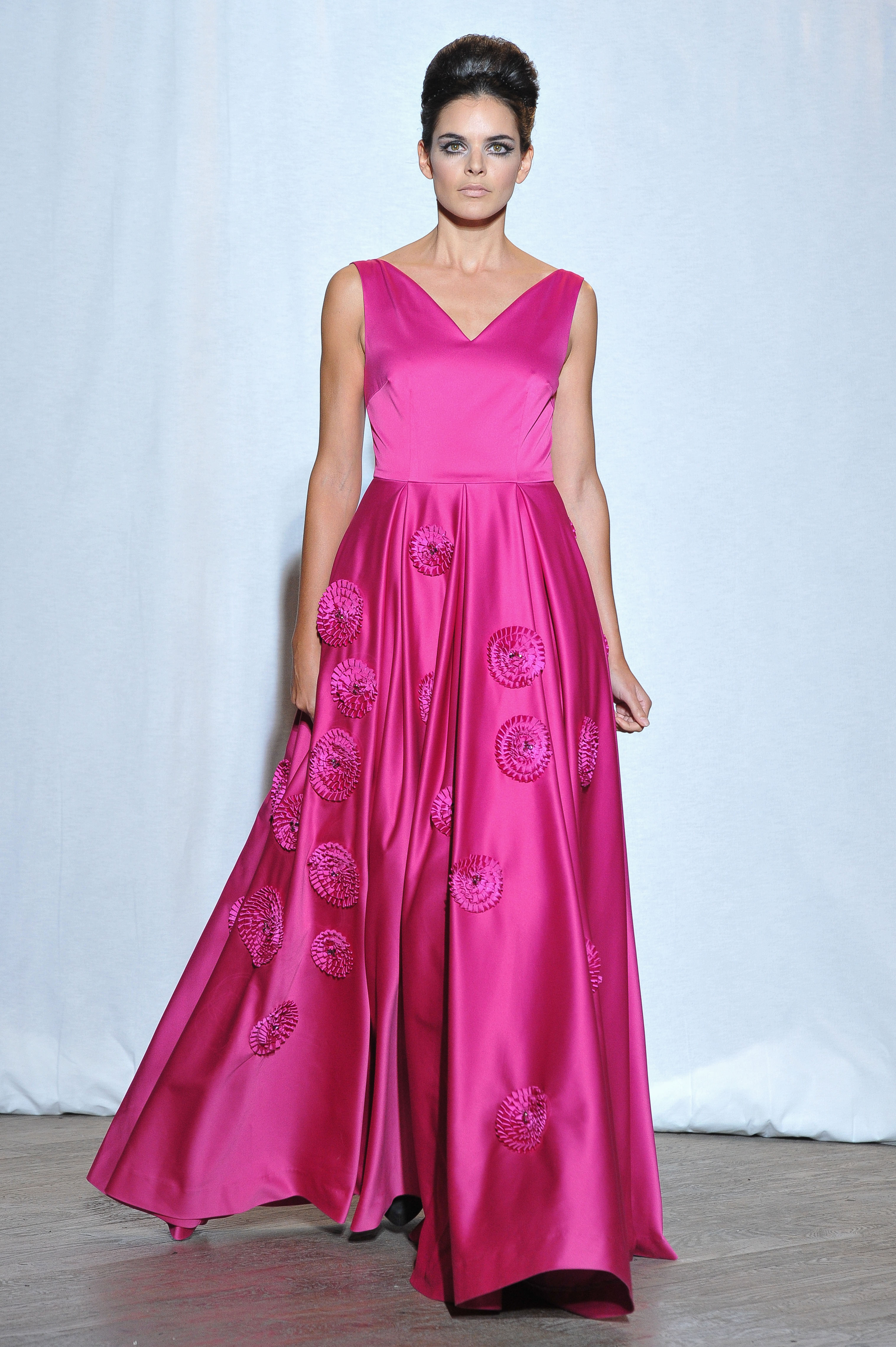 L’avènement de l’Op art et du psychédélique a influencé Christophe pour ses recherches de broderies et les applications de rubans dans une ambiance graphique. Quelques touches pop au niveau des coloris dont le rose fuchsia intense, le turquoise, le rouge rubis ou le bleu-violet animent le noir et le doré qui sont largement déclinés. Le satin duchesse est plébiscité dans des volumes spectaculaires autant que le tulle dans des maxi robes évanescentes. Quelques touches de broderies ethniques rappellent la psychédélique Goa.
