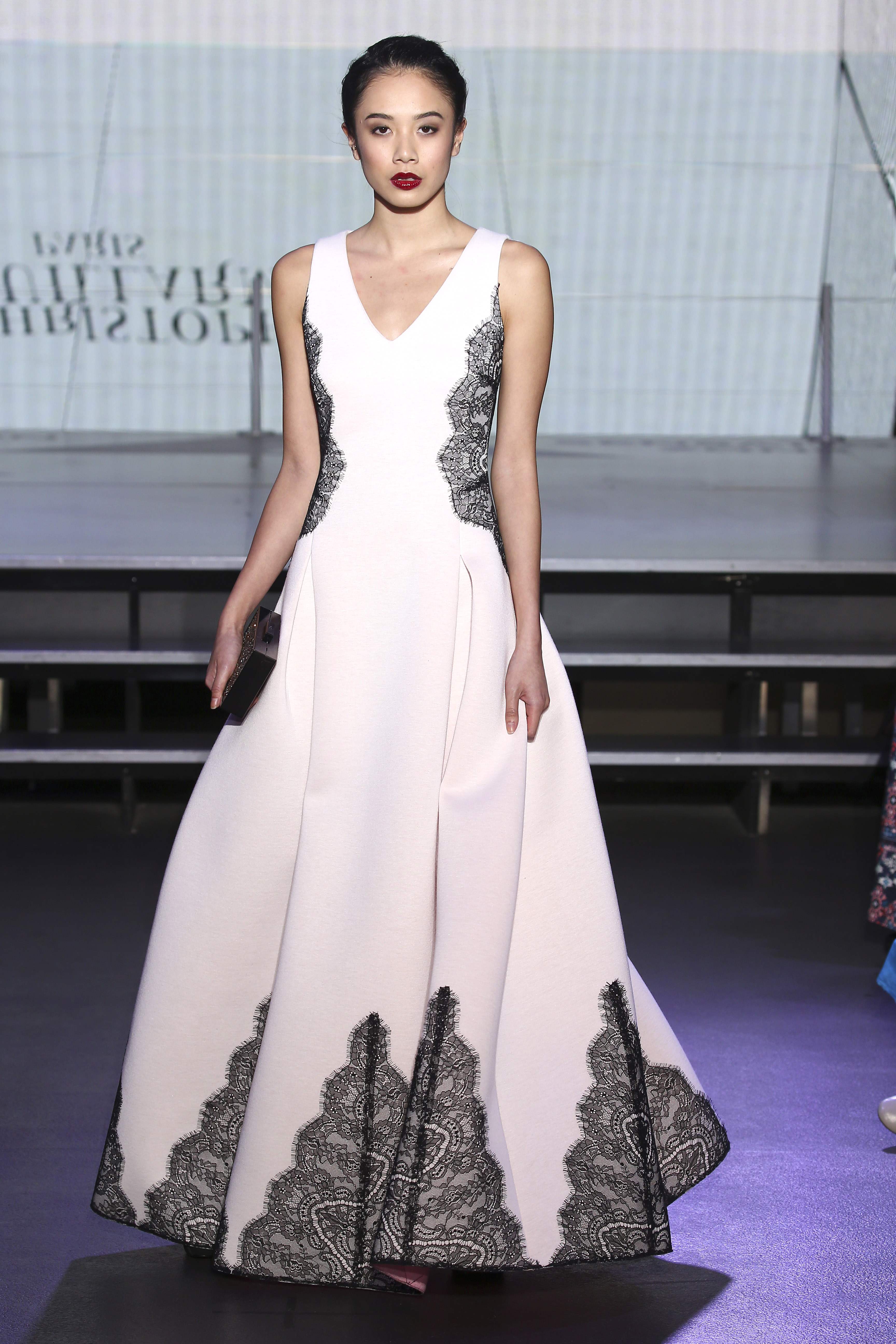 Une ambiguïté qui s’exprime sur les vêtements de manière accidentelle : soit un maxi motif en découpe laser en forme de cible, ou en entrelacs de rayures sur taffetas en jacquard de soie, également un esprit yin & yang graphique traduit en crêpe ou en néoprène appliqué de dentelle noire.