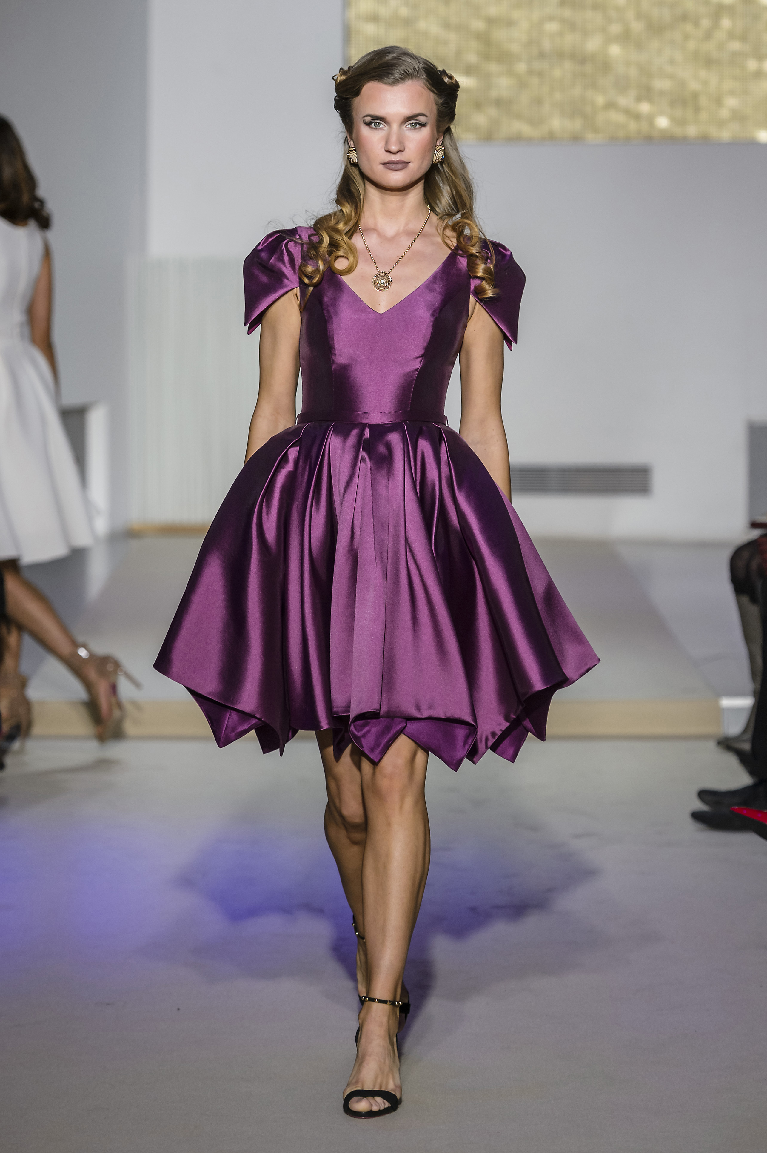 Le tulle vaporeux est à l’honneur dans des teintes de sable doré et de rose fanée alors que la faille de soie se teinte de coloris rouge rubis appliquée de dentelle ton sur ton dans une encolure bateau, ou bien se pare d’un rutilant imprimé de papyrus technicolor sur fond noir. L’audace de la reine se retrouve dans les coupes tant dans un effet mille-feuilles de résille plumetis volantée que dans la modernité des savants pliages de feuilles de papyrus prune inspirés d’origami.