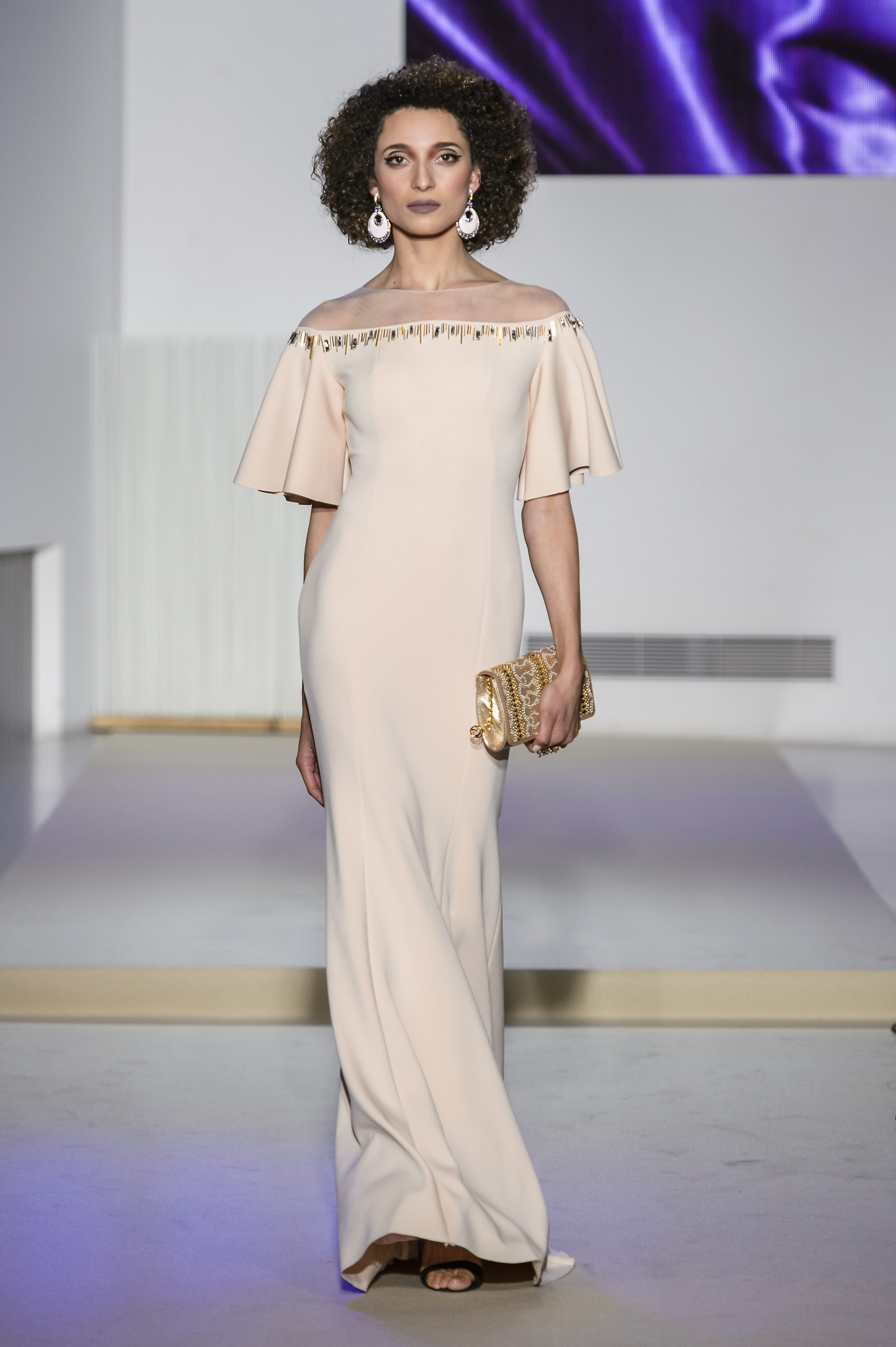 Les superpositions de jupons de tulles en jeux de transparence sont une vision actuelle de la sublime Néfertiti tentatrice et sensuelle. Mais elle se révèle également majestueuse dans une incroyable robe bustier à cape incorporée. Les applications de cristaux baguettes omniprésentes font scintiller le glamour de cette icône échappée de la Dolce Vita dans ce monde digital, qui résonne dans cette collection mystique et enchanteresse.