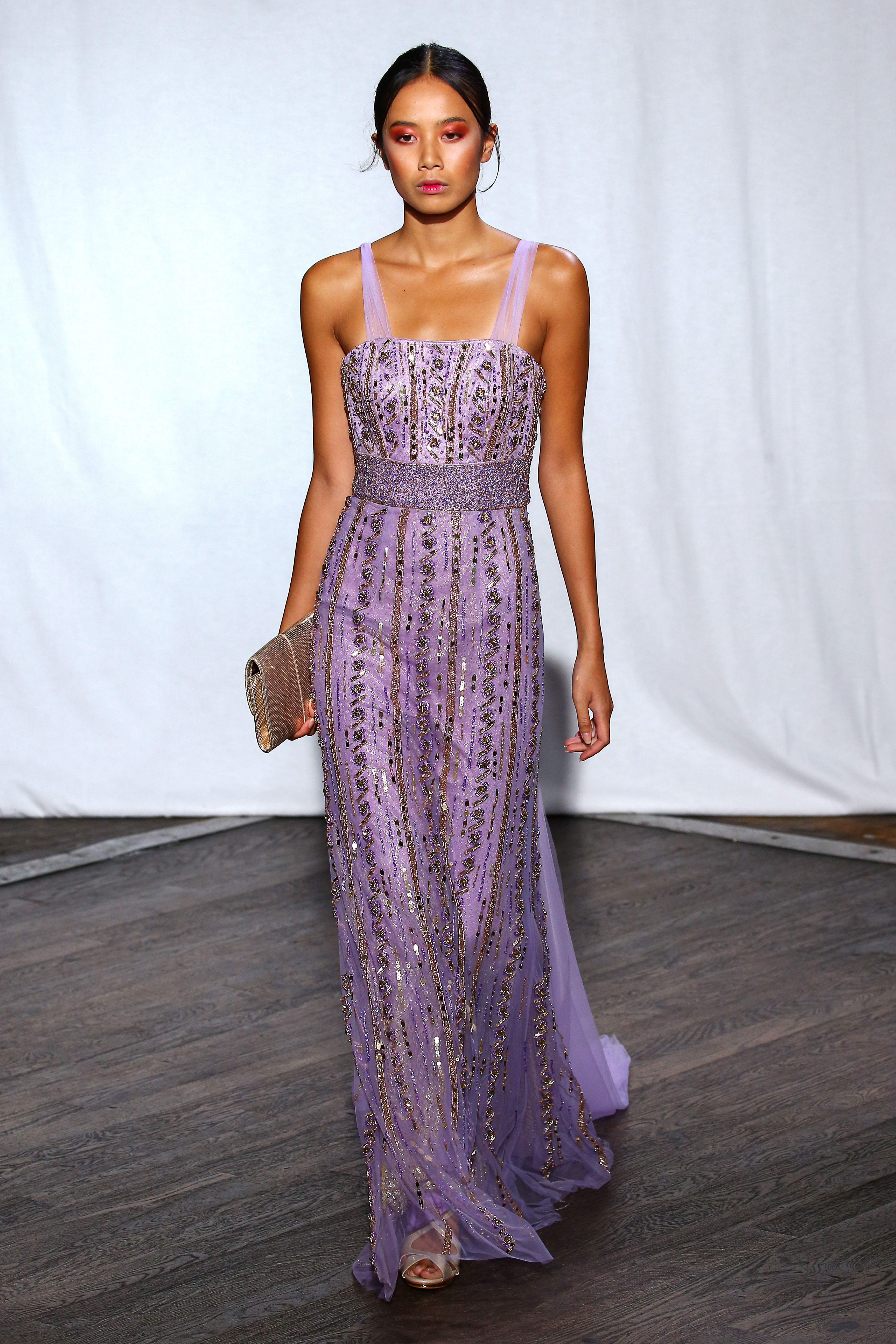 Tandis que la madone dévoile des dentelles blanches plissées et des imprimés fleuris, son double dans le miroir joue le glamour rétro version traîne en broché argenté, ou en maxi robe en faille de soie. Silhouette de sirène éthérée en tulle bouillonné ou mélange de noir et blanc enivrent et distillent une nouvelle écriture sur le fil du rasoir du fatal fourreau.