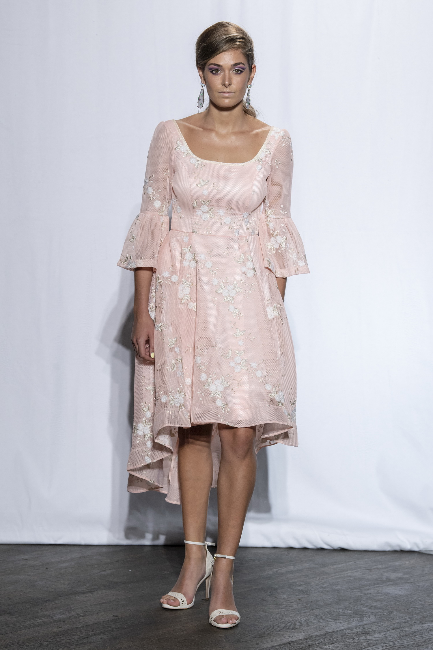 Ces couleurs sont le nude en dégradé de tulle, le rose poudré dans une maxi résille ou le pêche dans une dentelle volumineuse, le blanc en mini robe, le rouge passion en imprimé fleuri ou en crêpe envers satin et le doré en franges de broderies de perles…