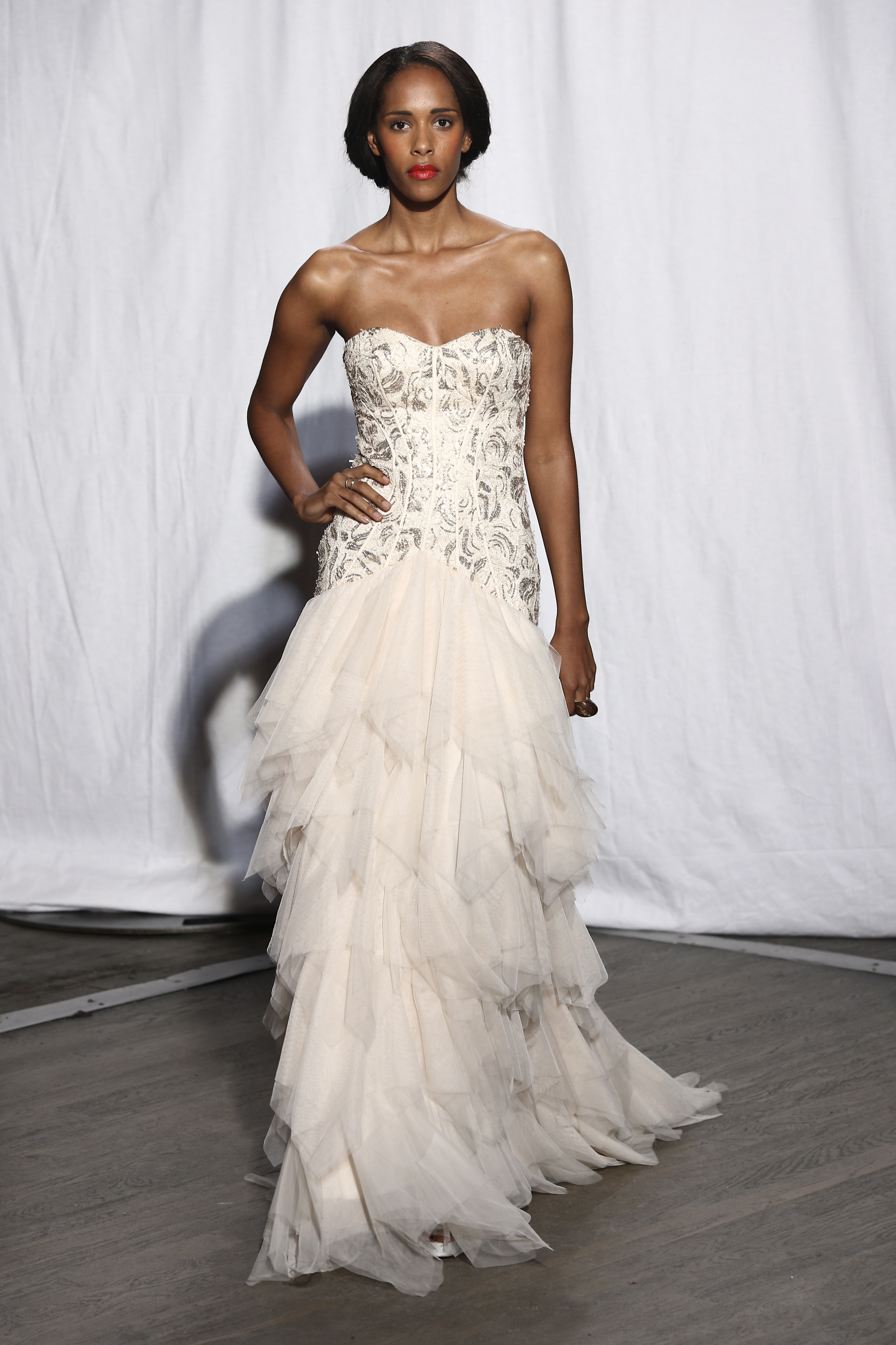 Robe bustier en dentelle rebrodee de paillettes et cascade de volants de tulle ecru. Strapless long dress mix with sequined lace and off-white mesh frills. Mandy - Christophe Guillarme Collection Printemps-Ete 2015 "Pop Sylphid" - Balajo - Paris Fashion Week