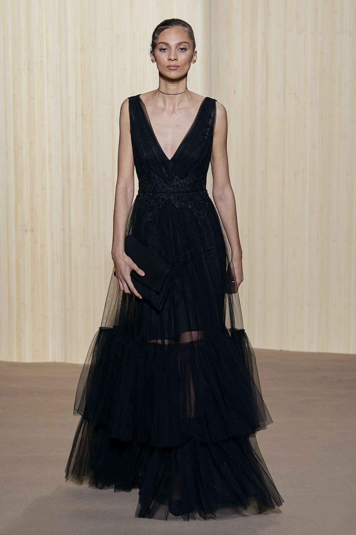 Une élégance hiératique et contemporaine lors d’une croisière stellaire : avec des broderies comètes, des jacquards feux d’artifices et une gamme déclinée autour des noirs colorés, prune et nude attisés de lueurs corail. Le tulle marine est rebrodé en voie lactée.