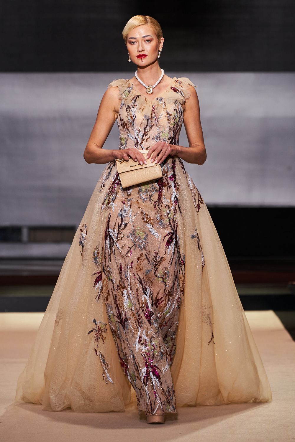 Intronisée Bronze Venus par ses fans, elle est réinterprétée dans des tons pastels, rose poudré, champagne et écumes de tulle en volume abstrait ou satin duchesse en rouge pourpre et fuchsia foncé jusqu’au bordeaux.