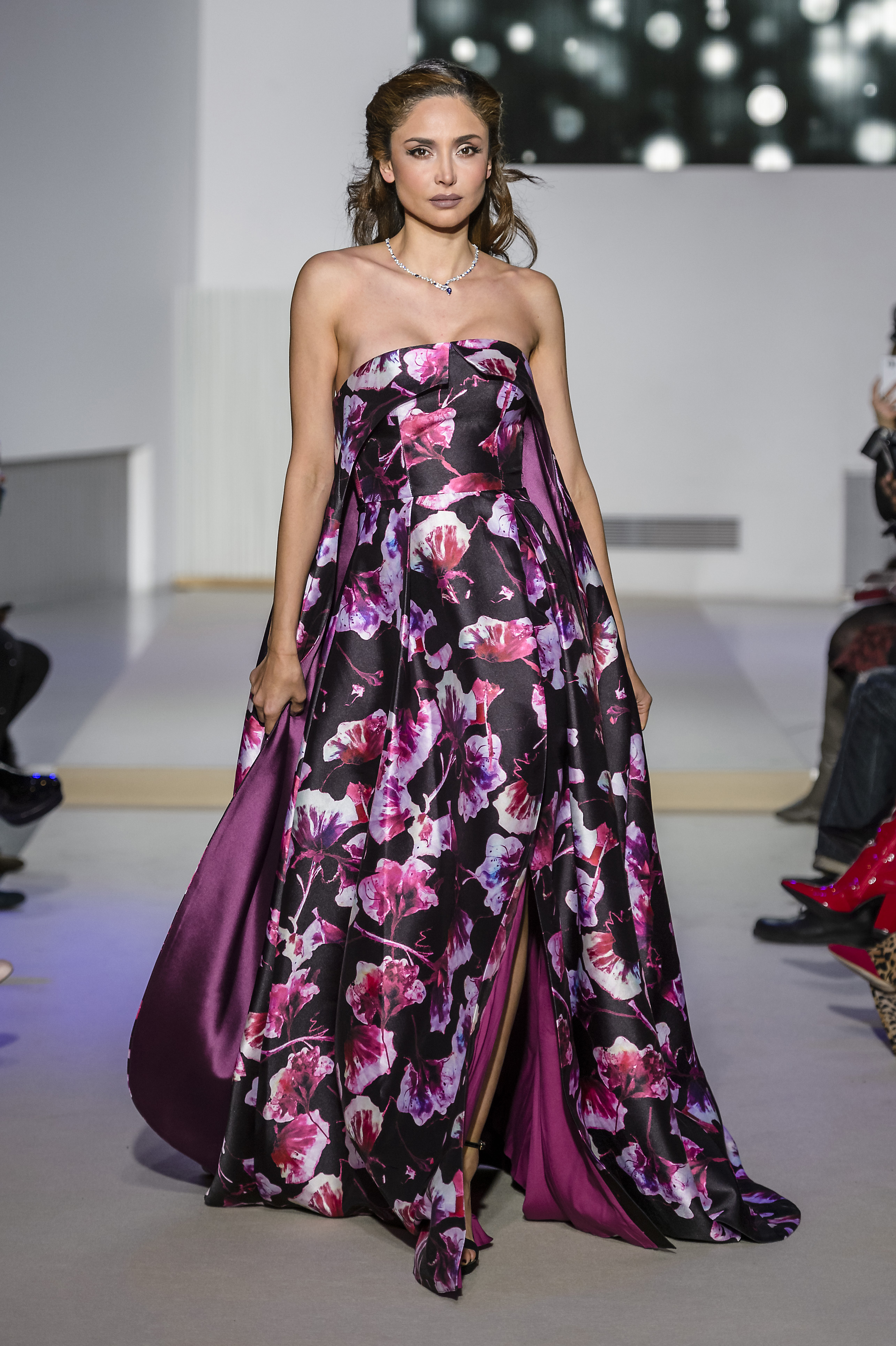 look 25 - robe longue bustier a cape incorporee en faille de soie imprimee de fleurs violette et roses, sur fond noir long strapless cloak dress in mikado, with violet and pink flowers patterns on black background - Patricia Contreras