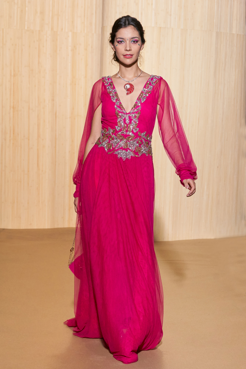 Pour sa collection Printemps-Été 2024, le créateur Christophe Guillarmé a été inspiré par la déesse Indienne à fleur de lotus Lakshmi et de l’imagerie de Bollywood. Un glamour à la joie de vivre débridé et au chorégraphies iconiques de Aishwarya à Deepika.