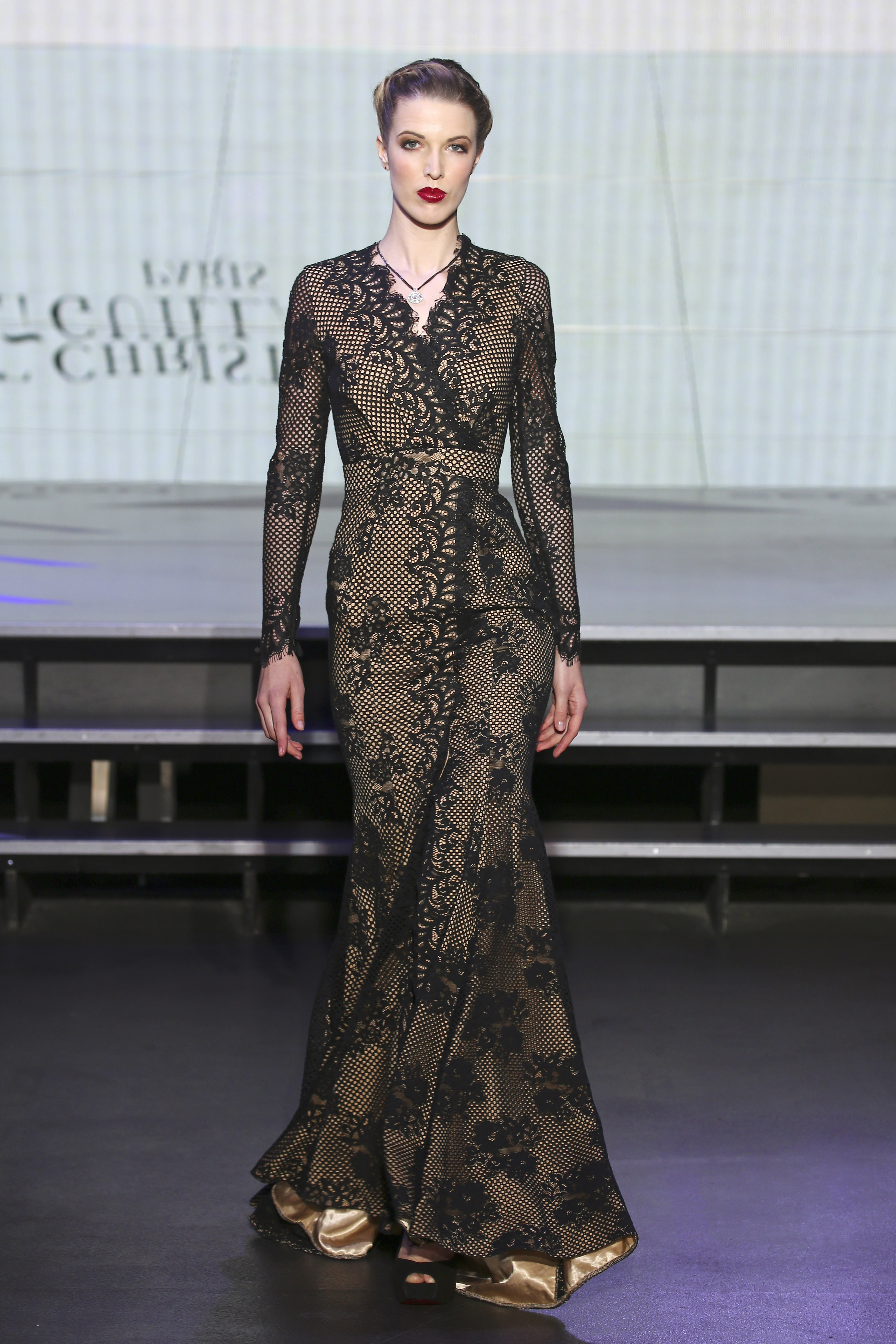 Defile Christophe Guillarme Collection Automne-Hiver 2016-2017 - Psyche - a L Atelier Renault - PFW - Fourreau en dentelle noire doublee champagne fendu devant. Black lace mermaid gown slitted on front. Meryl