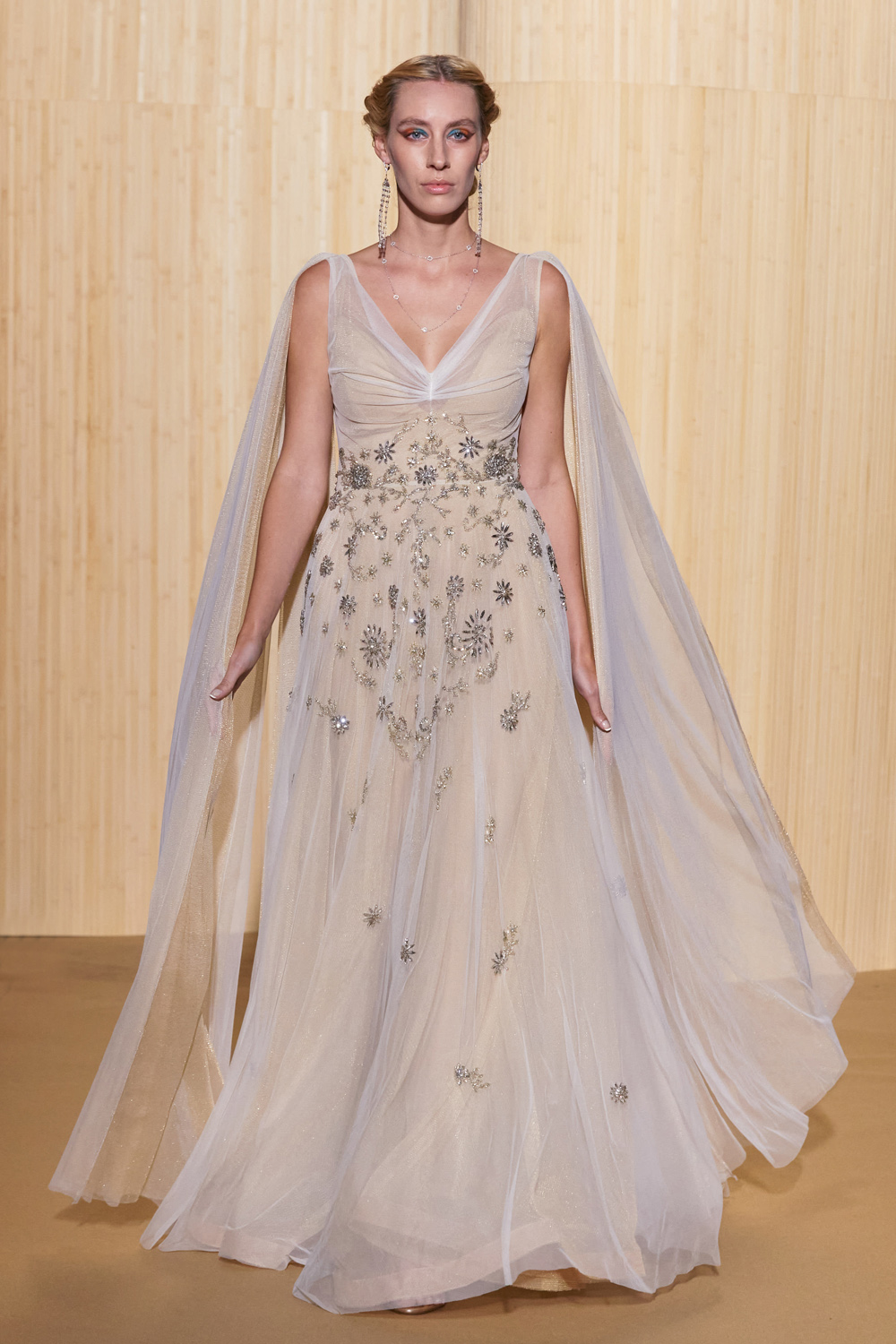 look 11 - longue robe rebrodée en tulle blanc et doré avec panneaux aux épaules - long embroidered dress in white and gold tulle with shoulder long panels - Magda Swider
