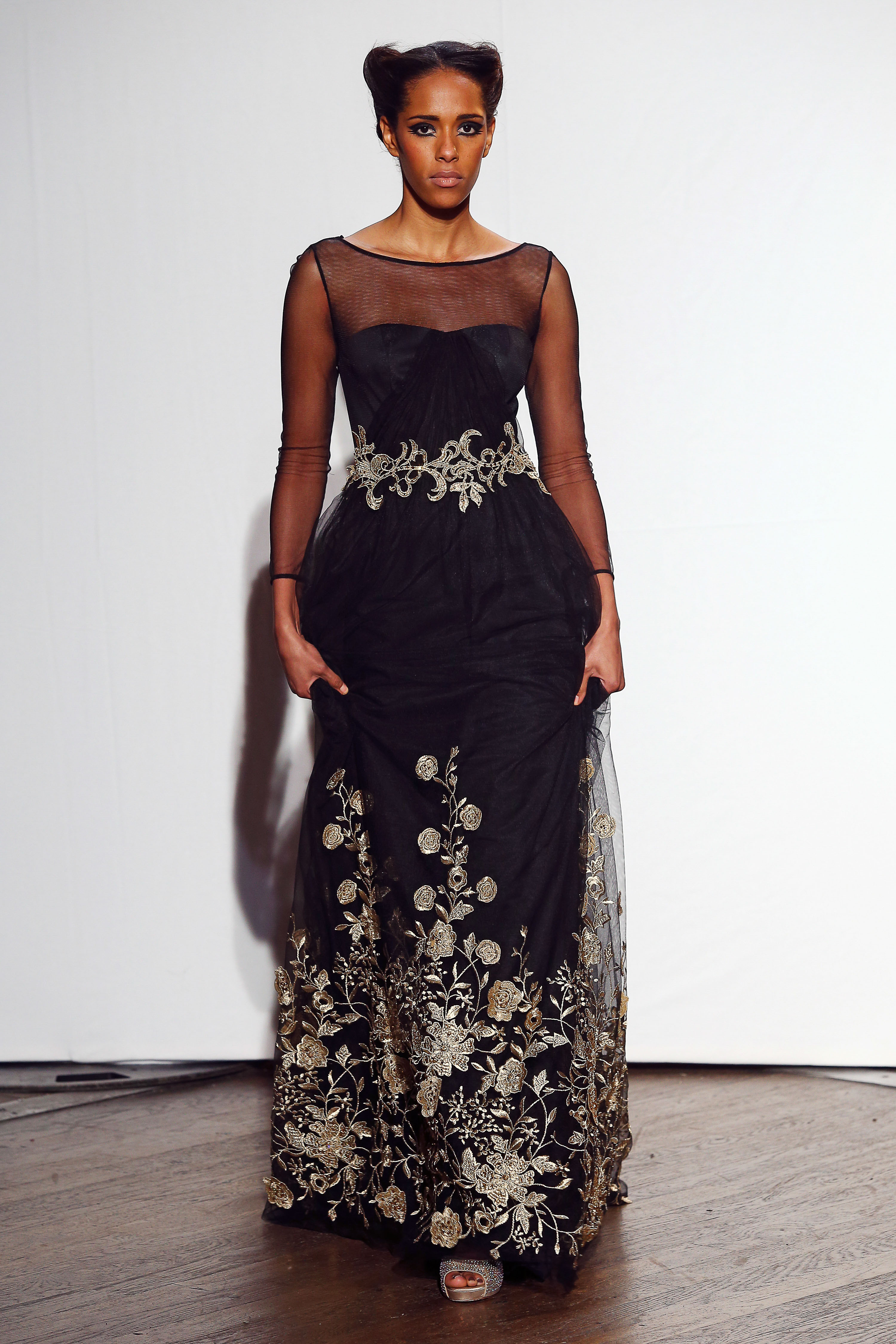 Maxi robe en tulle noire bordee d’applications de broderies florales dorees. Black tulle maxi dress with a large golden flower embroideries border at the hem. Mandy.