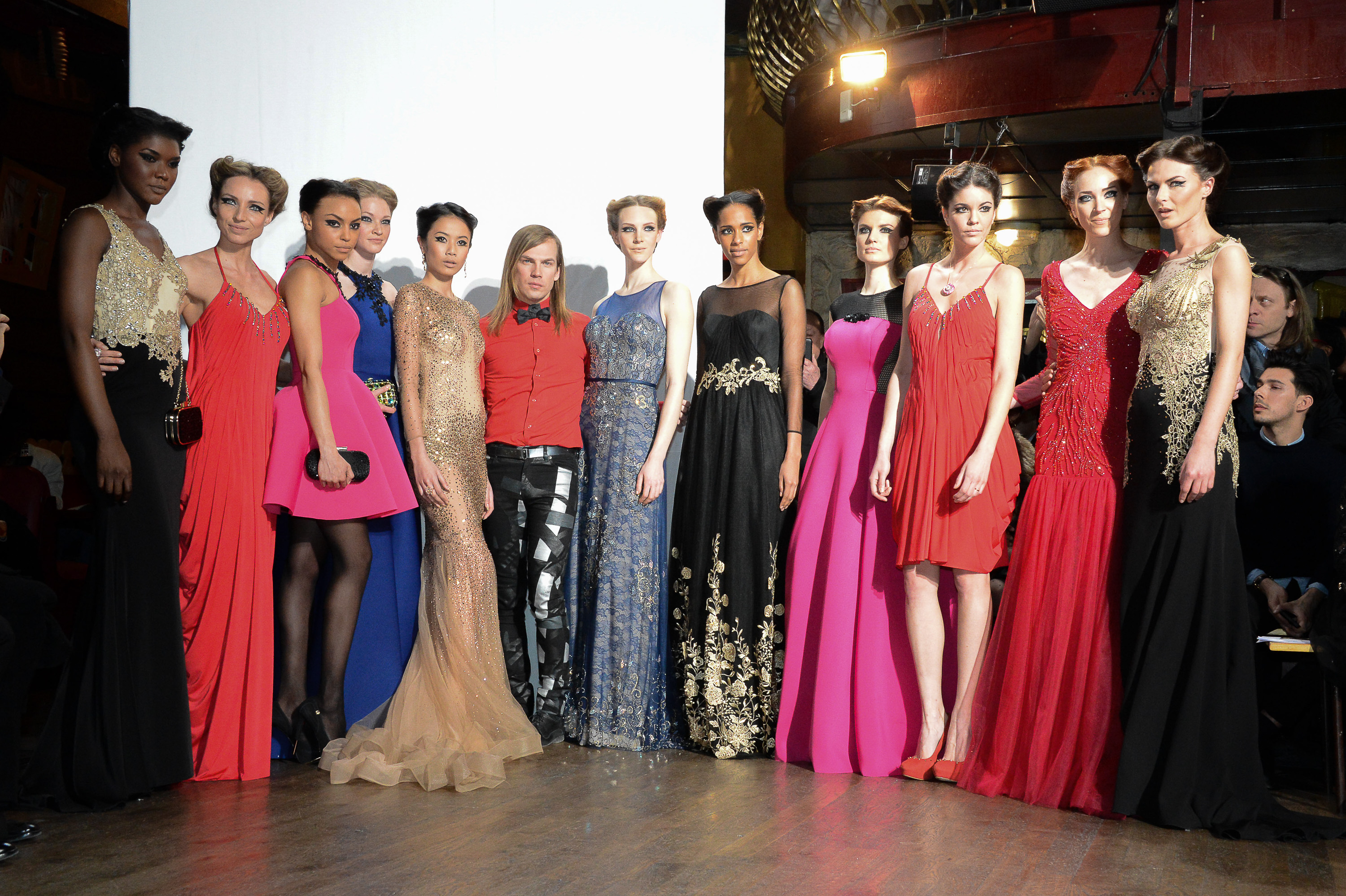 Inspiré par le film « L’Orchidée Noire » réalisé par Martin Ritt avec pour tête d’affiche la sublime Sophia Loren en veuve noire mystérieuse, Christophe Guillarmé réinterprète un style rétro, mâtiné de Old Hollywood mixé à la Dolce Vita. C’est l’image d’une Napolitaine en voyage à Los Angeles portant soit une mini robe en néoprène imprimé noir et blanc avec manteau coordonné soit un fourreau en jersey noir au buste en transparence constellé de pierreries. Le rouge passion est décliné en plusieurs looks, et le fuchsia d’hiver réservé pour des pièces volumineuses, mêlé à la résille noire ou appliqué de dentelle noire.