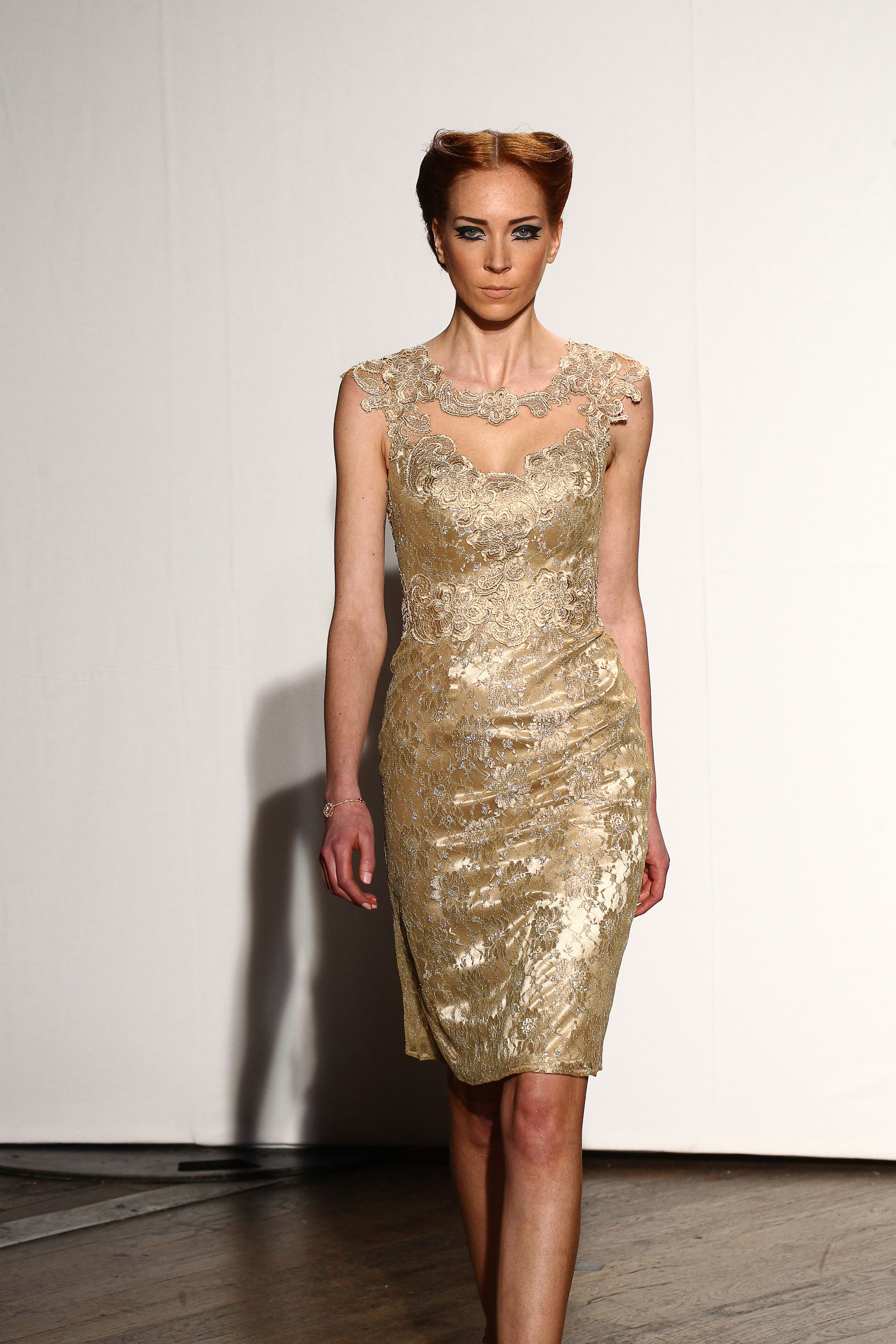 Robe ajustee en dentelle mordoree appliquee de dentelle beige. Golden lace fitted dress applied with beige lace. Johanna.