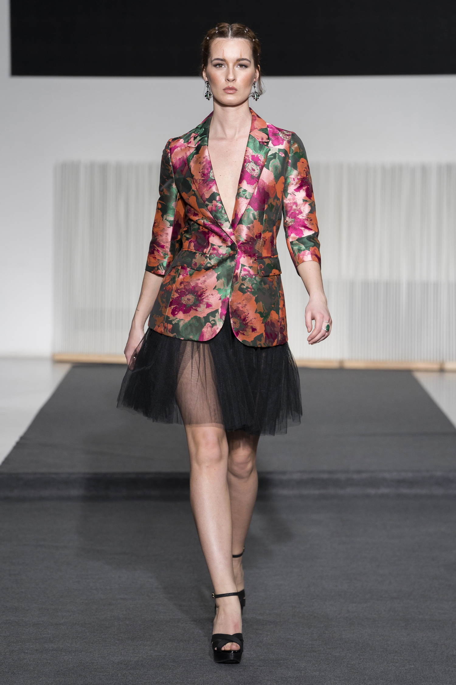 Look 3 - veste avec manches trois quarts en jacquard noir et rose fuchsia - jacket with ¾ sleeves in black and fuchsia pink jacquard - Shirley