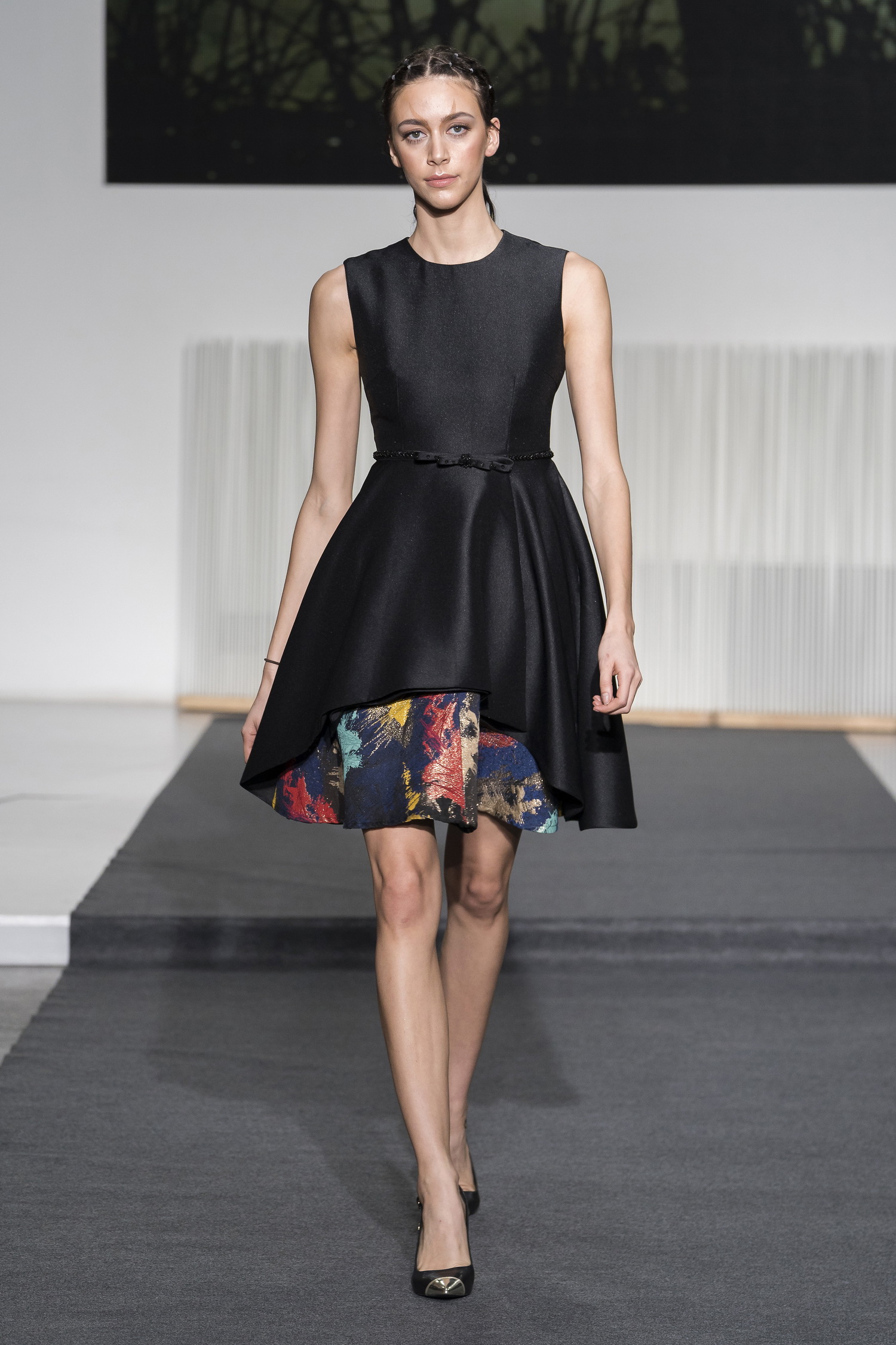 Look 5 - robe courte portefeuille en faille de soie noire et panneau en jacquard multicolore - black Mikado overlapped short dress with one pannel in multicolor jacquard - Ava