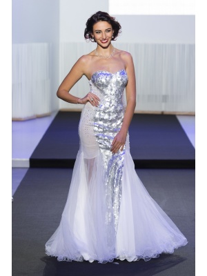 Mermaid long dress in white tulle slightly seethrough on sides covered with silver sequins & crystals